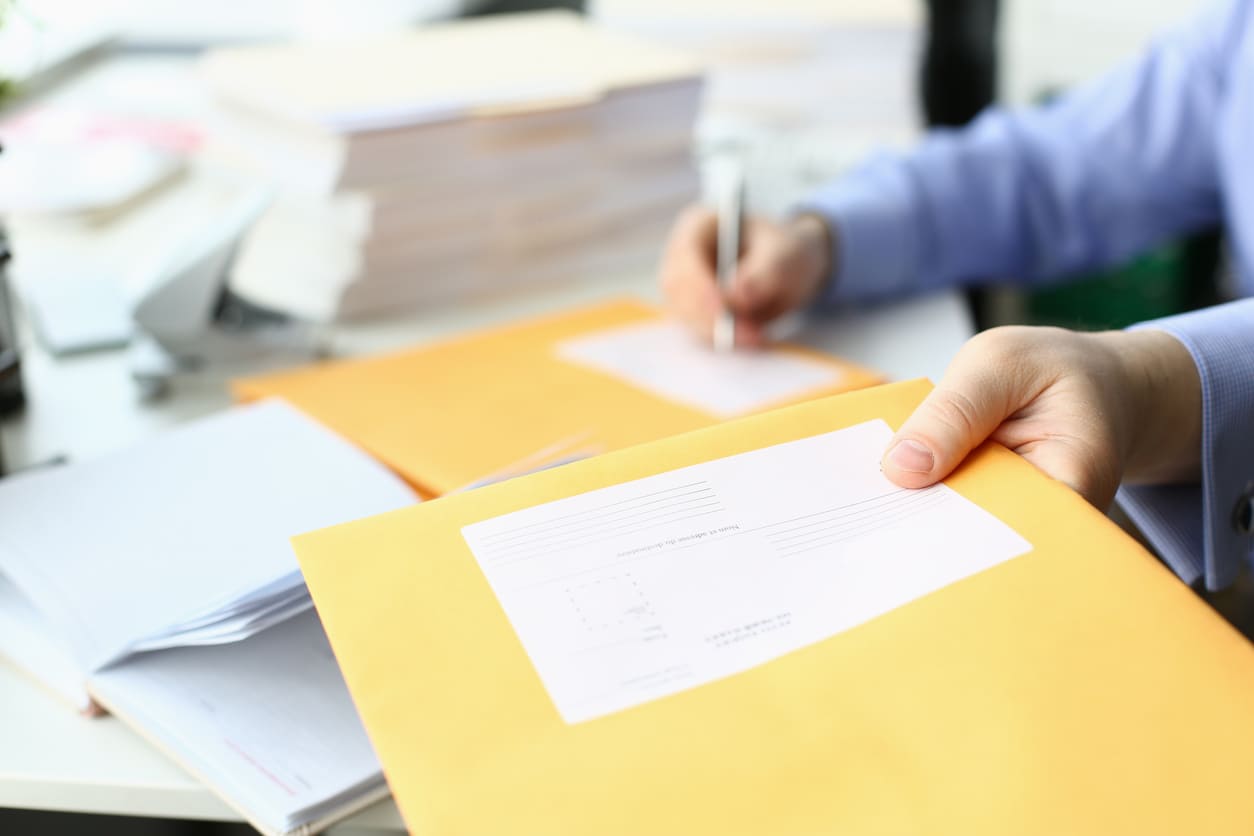 郵送請求の際は、封筒の表に「土地家屋調査士請求」と朱書きした上で、返送用として郵便番号・住所・氏名を記載し、120円切手を貼った角形2号(A4判)の封筒を同封してください。