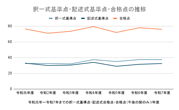 択一式基準点は、令和3年度の32点が最も低く、令和4年度、令和6年度および令和7年度の37.5点が最も高い数値です。