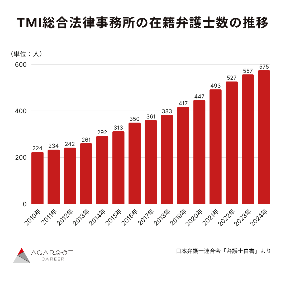 TMI総合法律事務所の在籍弁護士数は、2010年の224名から2024年には575名へと増加し、この14年間でおよそ2.6倍に拡大しています。毎年着実に弁護士数を増やしており、一度も減少していない点が特徴です。