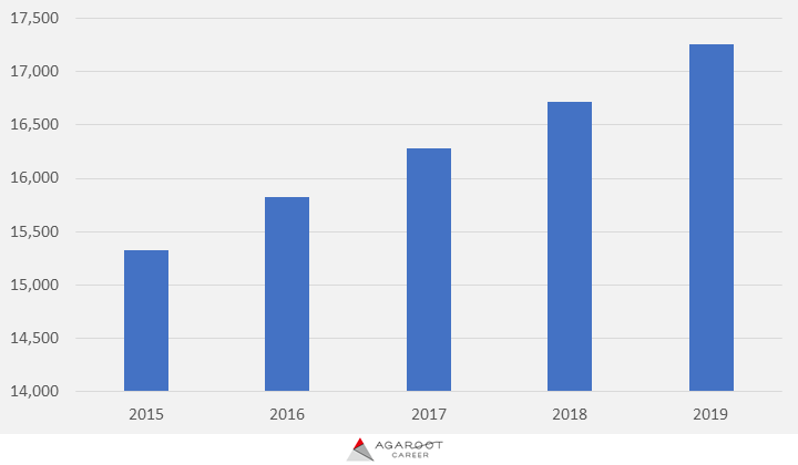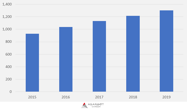 先述した通り直近5年間(2014年~2019年)において弁護士事務所の数は毎年500軒前後増加しています。