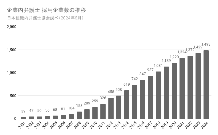 日本組織内弁護士協会の調査によると、インハウスローヤーを採用している企業数は、2024年6月現在で1,493社でした。